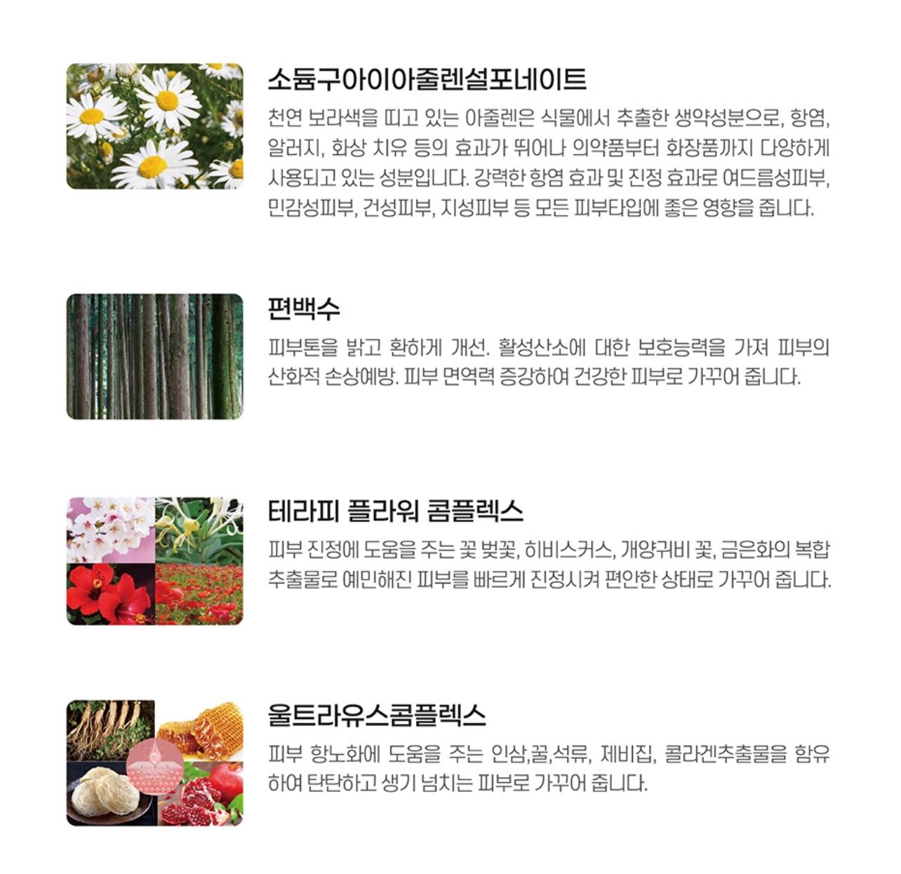 肌鎮静に役立つ桜、ハイビスカス、ポピーの花金銀花の複合エキスで、敏感になった肌を素早く鎮静させリラックスした状態に整えます。