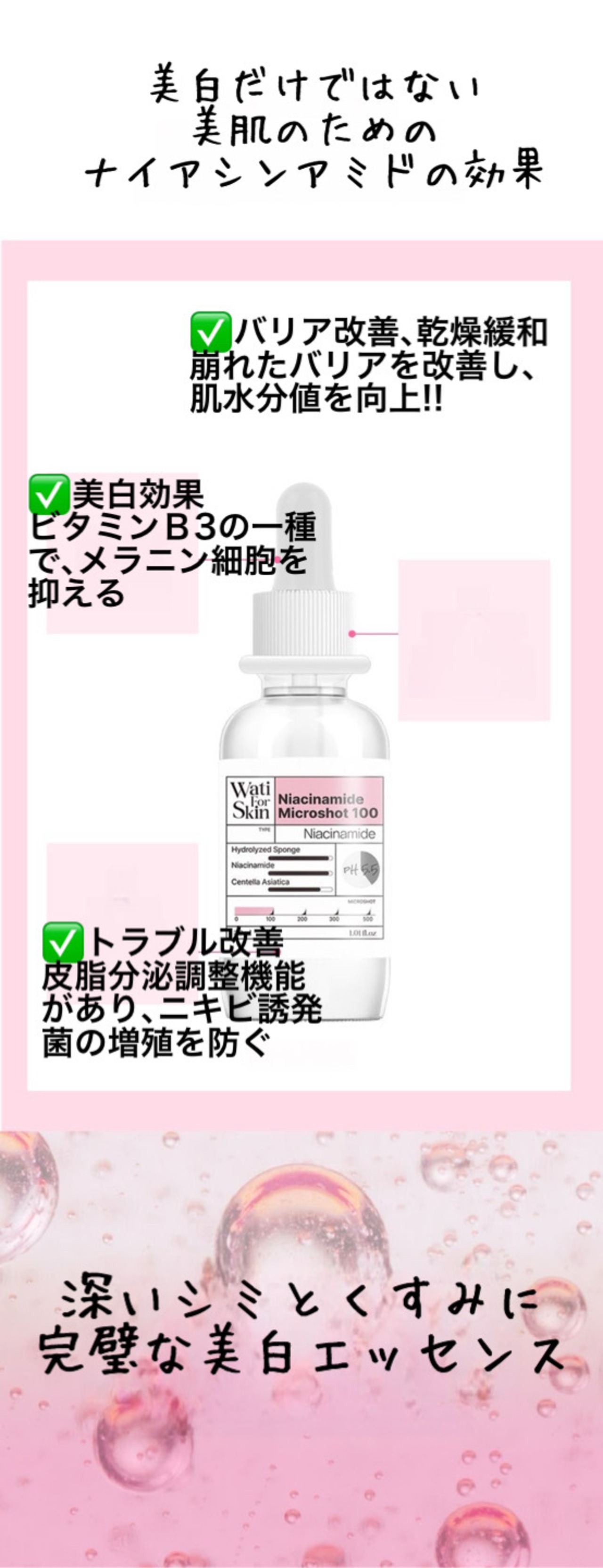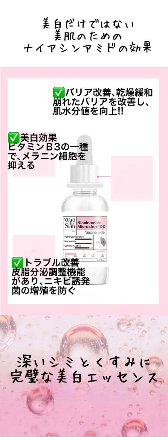 ナイアシンアミドはもともと人の体の中でも生成されている物質で、肌トラブルのリスクや副作用が低い成分です。